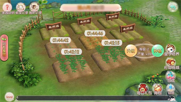 2、在家园系统中,玩家每天可以在右下角的每日礼包中领取粮票和种子,粮票可以用于商城中购买种子,也可以用于皇子培养。玩家初始状态只能拥有一块土地,之后可以通过售卖所种植物换取粮票,用粮票解锁田地或给土地升级以增加产量。