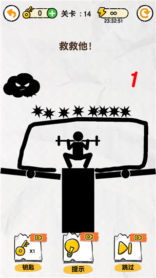 9、第29关(救救他):在大锤砸下来之前,画一个斜倒“V”,让大锤砸在线上。