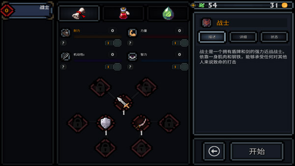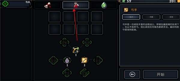 7、游戏开局会有三个角色,战士、弓箭手、巫师,不同角色技能是不一样的,玩家可以自己慢慢探索下哦。