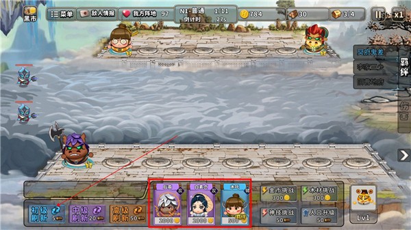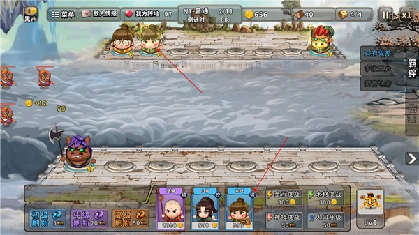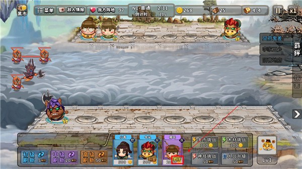 1、游戏开始,点击左下角的刷新,根据等级的不同刷新三个级别的角色,点击角色即可花费金币购买。