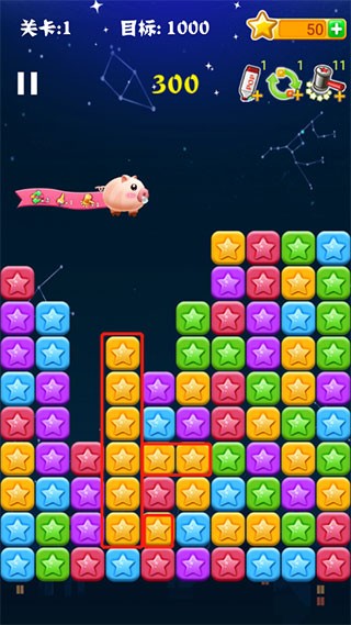 2、消除方法是,点击颜色相同成块的方块或者星星,它就能被消除,同时消除的方块越多分值越高,你也可以尽量让所有的方块被消除,那可是很厉害的。