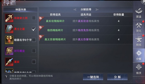 如果三条属性中没有奥义伤害,则可以先将这个神器佩戴,使用绑定魂晶开启精炼属性,直至开出奥义伤害属性后再替换下来进行分解。这一技巧同样适用于交易行购买神器进行分解的情况,玩家可以在购买前查看交易行上的道具tips,只挑选具有奥义伤害属性的神器购买即可。