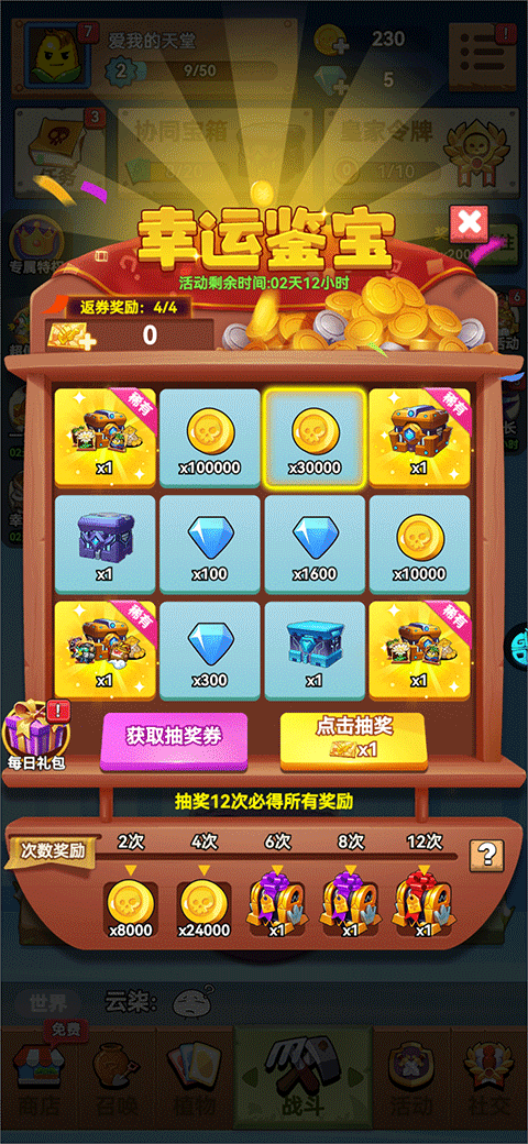5、幸运鉴宝:玩家通过使用抽奖券进行抽奖获得金币,若抽奖次数达到下方次数奖励后,黑可以额外获得金币、宝箱奖励