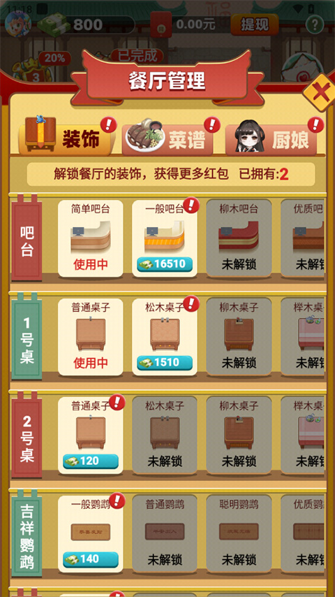 1、玩家在游戏主页中点击【餐厅管理】,在打开的餐厅管理页面下进行装饰、菜谱、厨娘的更新替换操作