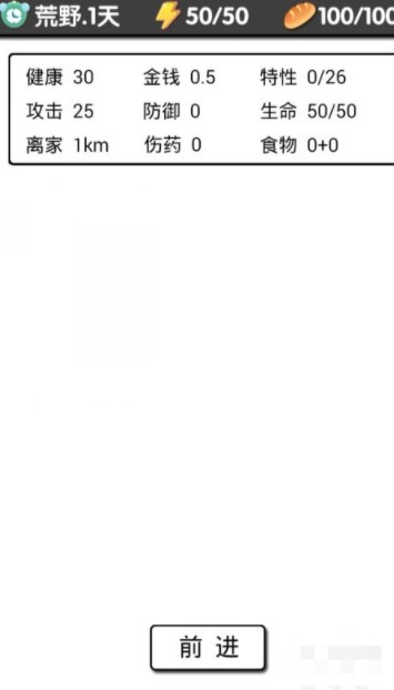 我们的健康价值、金钱、攻击、防御、生命和离家的距离都会显示在屏幕的顶部。我们可以点击屏幕底部的“前进”按钮前进,这与许多纸牌游戏中的“探索”意思相同。