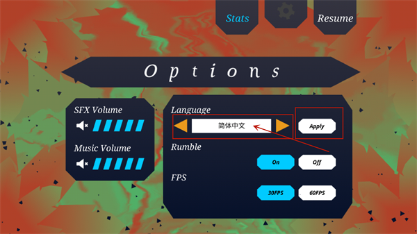 2、在设置界面点击箭头按钮可以将English切换至简体中文,点击Apply确认选择