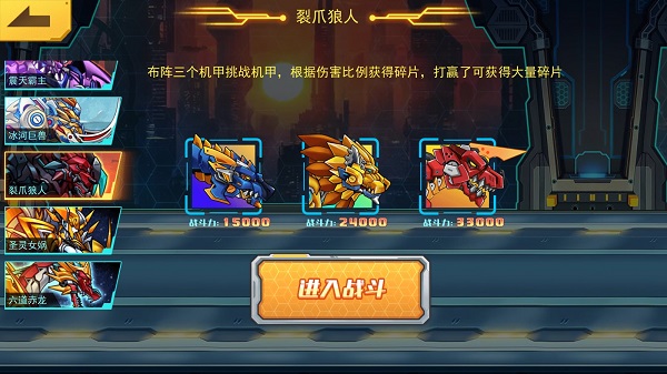 接下来返回主页,打开“每日副本”,在众多机甲中找到「烈爪狼王」,然后上阵三个你已拥有的机甲进行战斗,根据伤害比例,打赢了就能获得碎片。