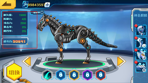 3、右侧为当前机甲可进行的装备,点击可以查看到具体属性,用零件进行购买穿戴。