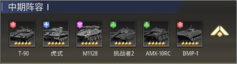 采用T-90+虎式+M1128+挑战者2+AMX-10RC+BMP-1阵容,该阵容越战越勇,还具有一定回血和控制。