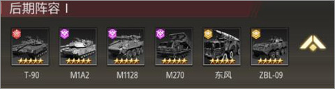 采用T-90+M1A2+M1128+M270+东风+ZBL-09组合,该阵容超强的控制、回复,同时对对方造成高额的流血伤害。