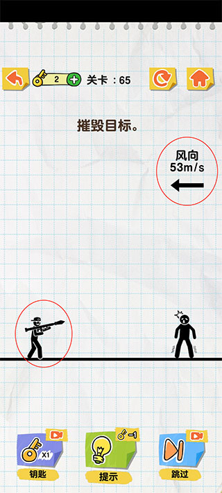 2、先将右上角的风向图标给涂掉,在点击拿火箭筒的火柴人即可摧毁目标。