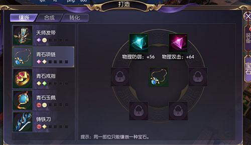 完成【落井下石无处躲】任务即可通过镶嵌宝石来获得额外的属性加成,装备初始有2个宝石孔,升阶后就可以获取一个额外的宝石孔,放入对应的宝石就可以增加基础属性了。值得注意的是,合成宝石的同时可以增加宝石的光泽度,当光泽度达到一定程度时玩家还能获得炫酷羽翼效果,堪比神器的强大装备将由你一手铸造。