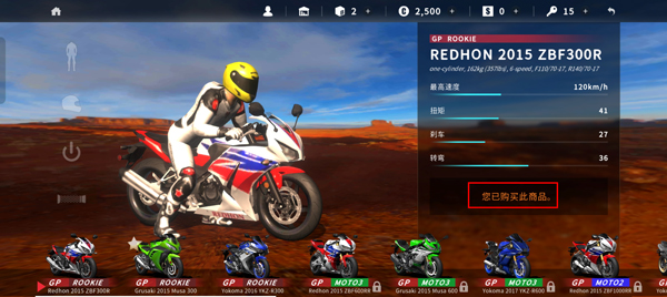 2、下方有好几个选项可以选择,我们点击选择摩托车,然后购买其他摩托车就可以换车了;