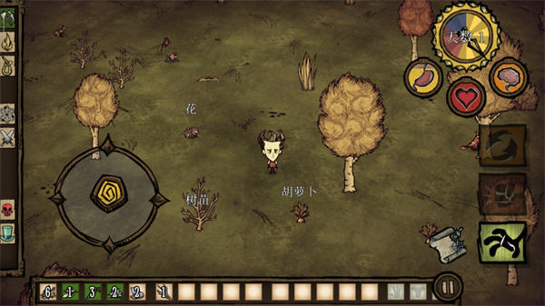 4、游戏就正式开始了,左边是控制角色方向的,右边是收集的,玩家需要收集一切能被利用的资源来躲避饥荒,