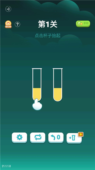 4、我们接着尝试水排序解密游戏,玩家只需要点击杯子抬起,然后将相同颜色的水放在一个烧杯里即可,