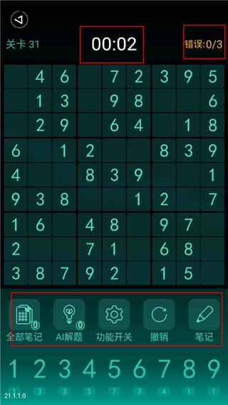 3、进入游戏,玩家有三次机会,还有时间限制,我们可以通过下方的笔记、AI解题、功能开关、撤销和笔记等功能选项帮助我们更好地通关,
