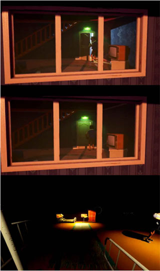 制作组曾经大肆宣扬过邻居的AI是极其先进的,如果仅以邻居的进攻性来看,所言非虚。一丁点的风吹草动都可以引起邻居的察觉,哪怕你只是躲在一个储物间里瑟瑟发抖,邻居有的时候也会找到你,简直如有顺风耳千里眼加持一般。当然,玩家也可以反过来利用这一点,利用小道具声东击西,将邻居引开,不过时间并不长。若是玩家过于依赖使用同一种方法,邻居会使出针对性的对策来埋伏玩家——比如玩家喜欢从前门突破,那么下一次前门的屋檐上可能会设置水桶陷阱;倘若你青睐从后院偷偷摸摸行动,那么可能下一次翻进去的时候等待着你的就是一个捕兽夹。总之,具有一定学习性的AI的确会迫使玩家使用不同的策略,给游戏提供了更多玩法深度。