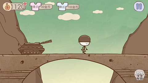 游戏目标就是要让史小坑安全的通过大桥。看到豆腐渣工程桥,你当然不能直接开着坦克过去,要不然非死不可,点击坦克,坦克会停下,然后一直点击史小坑,直到通过即可。