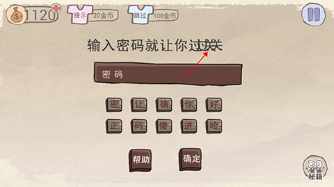输入“密码”之后,不要点击确定,只要点击“让你过关”中的“过关”两个字,就能顺利通关啦。哈哈,真是坑爹啊!