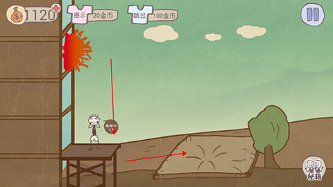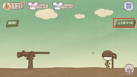 本关要将mune向左拉,然后出现一个让子弹飞一会的按钮,接着点击机枪发射子弹,最后疯狂的点击按钮即可。