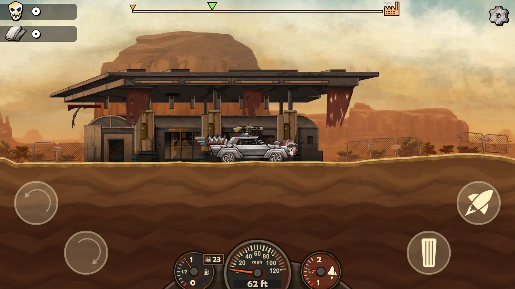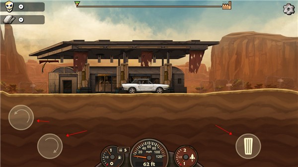 3、会操作之后就可以开始你在这个2D的世界中末日赛车狂飙了,但是我们的车子装备太差很难到达下一站。