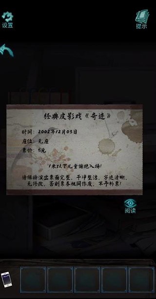 3、然后我们来到走廊东去调查一下,看地上新的脚印痕迹,看来有人刚进去了,不过门锁上了,进入房间后我们看到了【经典皮影戏《奇迹》】票和老式游戏机。