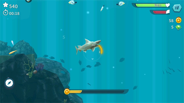 游戏操作简单,玩家可以很轻松的控制自己的鲨鱼,更难的是如何让它快速长大,游戏采用了仿真的3D引擎,仿佛真的把玩家带到了深海的世界。