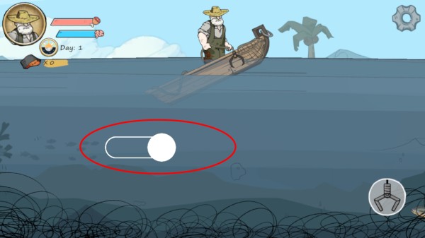 3、点击右下角钩子可以抛出鱼钩进行捕鱼,点击屏幕可以掷出鱼叉帮助捕获。