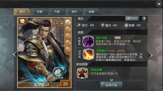 高渐离,同样是一各橙将,他的属性和技能较之其他橙将其实并没有太多差别,而之所以推荐他,不推荐其他的,则是因为他可以和荆轲一起激活组合技,焚星燃月,跟上面的红将组合技相比,打击目标只有三个,并且伤害也低了不少,但也算不错了,毕竟红将很难培养起来