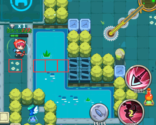 近4码的水域是什么概念呢,下图的水域约3码,1格表示1码,站在这个位置,可以直接突袭,猎手大概会翻滚到水域的中间那个格子,然后被强制跨到对面,差不多位移了4.5码