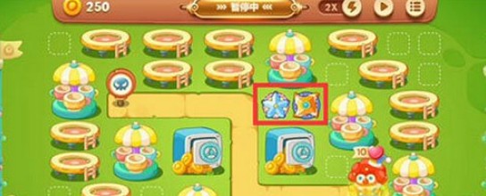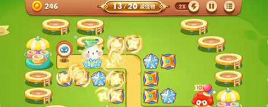 本关的道路比较短,所以我们需要利用减速的炮塔来增加对小怪的攻击时间。这里有冰冻星和雪花,因为雪花速度慢,所以前期选择冰冻星。