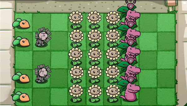 这个阵容的阳光产量是一大痛点且很难解决,所以我带了萝卜用于产阳光。至于萝卜的副作用,1~13波不需要怎么考虑,只要注意别让大爷、二爷、蓝橄榄这样的僵尸吃完萝卜进屋吃你的席就行。
