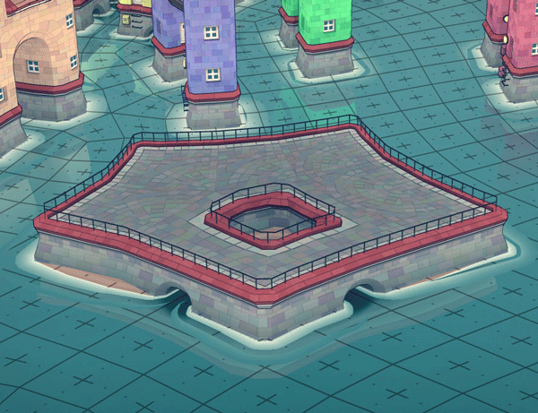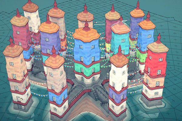 彩旗会在间隔1或者2个空间间隙的2层及以上建筑物之间生成,建筑物需满足上一层建筑基块与下一层的颜色不同。