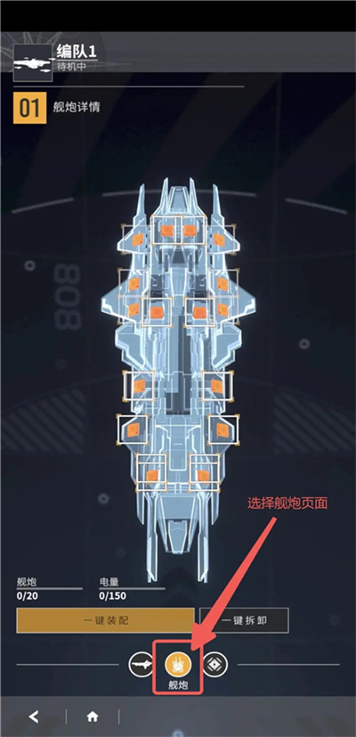 进入舰炮管理界面后,点击正方形网格,即可在对应的炮位上安装刚刚生产的舰炮了,当然也可以点击一键装备,自动安装当前已经生产好的舰炮