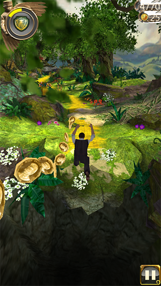 点击向前滑动就能够控制角色跳跃操作,该操作可以进入滑索状态,同时玩家重力感应左右倾斜手机来控制角色左右移动操作,收集各种钱币和躲避各种狭窄的道路