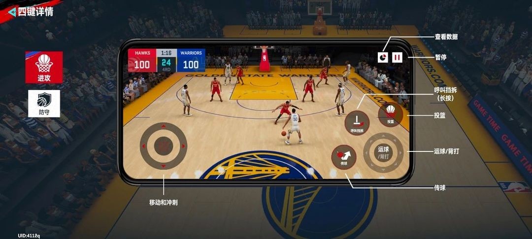 右侧按键+摇杆屏幕右侧的是游戏的基础操作按键,球员的进攻、防守类必要操作都会被放置在这个位置。