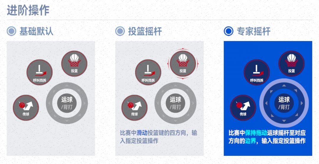 进阶操作基础默认操作不过瘾?你还可以选择进阶操作!游戏中提供了「投篮摇杆」和「专家摇杆」两种进阶操选择。