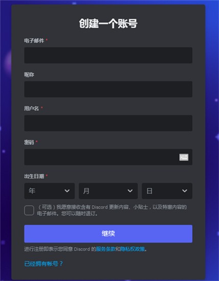 1、首先打开Discord注册页面,注意需要科学上网,填写注册信息,出生日期建议早于2006年的。