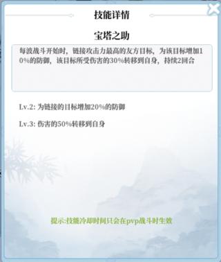 娉婷的被动技能一个是增加自身生命,一个是链接攻击最高的友军,增加其防御力,并且帮助链接友军承受部分伤害,持续2回合,