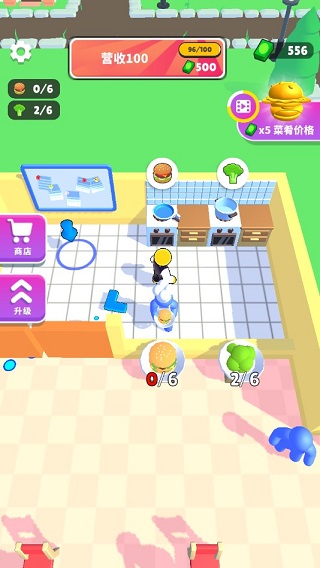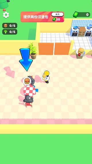 制作完成后,出入到餐厅,然后走到相应的位置处即可拿到汉堡,通过虚拟摇杆的控制,将汉堡包送到客人面前!