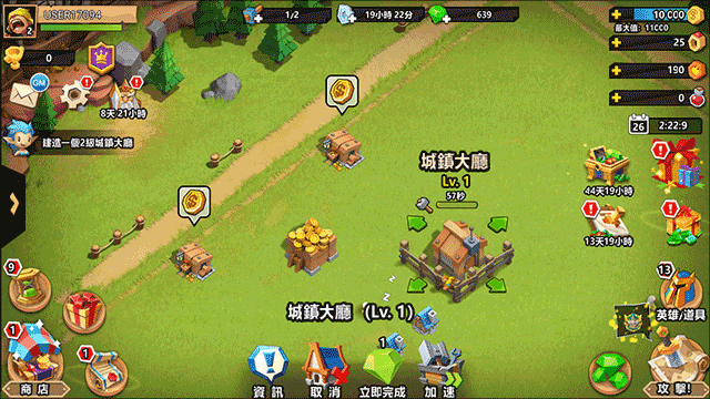 3、这里玩家可以对城镇大厅进行升级,在升级过程中,如果想放弃升级,只能退回一半的金钱;