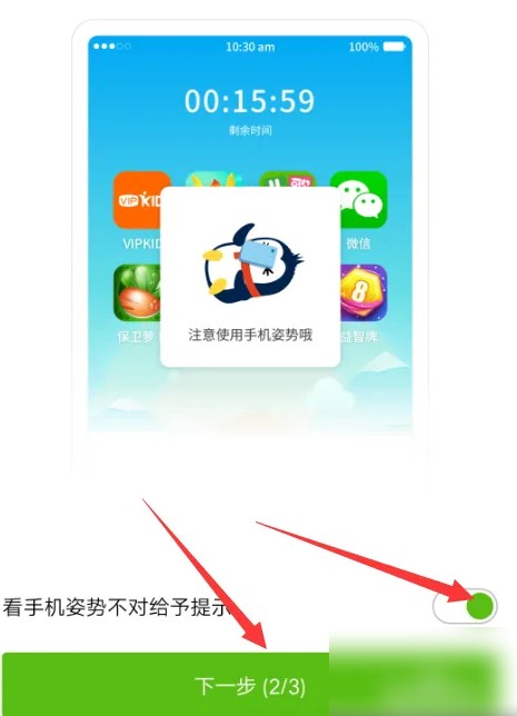 点击下一步后弹出预防孩子近视功能开启界面,打开姿势提醒功能然后点击下一步,如图。