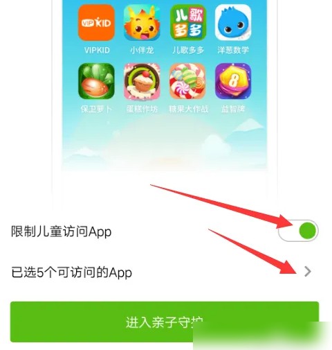 在弹出的限制孩子可访问的APP界面开启限制功能,并点击下方已选APP项,,如图。