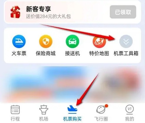 进入飞常准app,在机票购买界面,点击下图所示的“机票工具箱”。