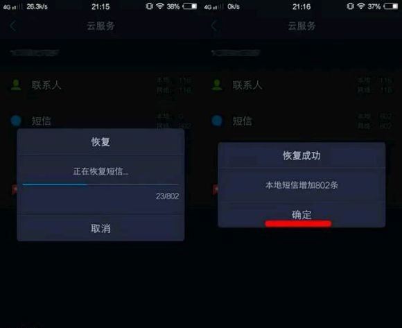 根据信息量,云服务很快通过网络将信息恢复到手机中,完成后点确定。