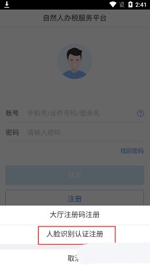 3、点击【注册】,选择【人脸识别认证注册】方式