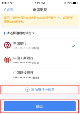 点击【申请退税】后,纳税人需选择退税银行卡。如您已添加过银行卡,系统将自动带出已填银行卡信息。如需新增,点击【添加银行卡信息】—【确定】。