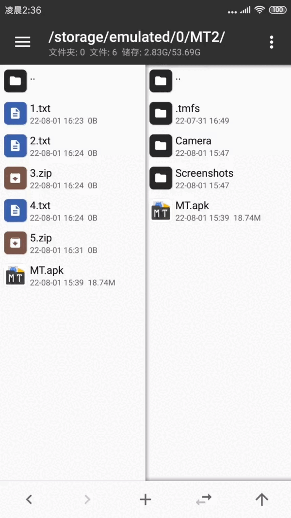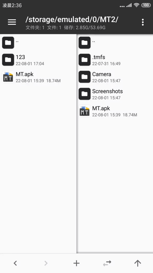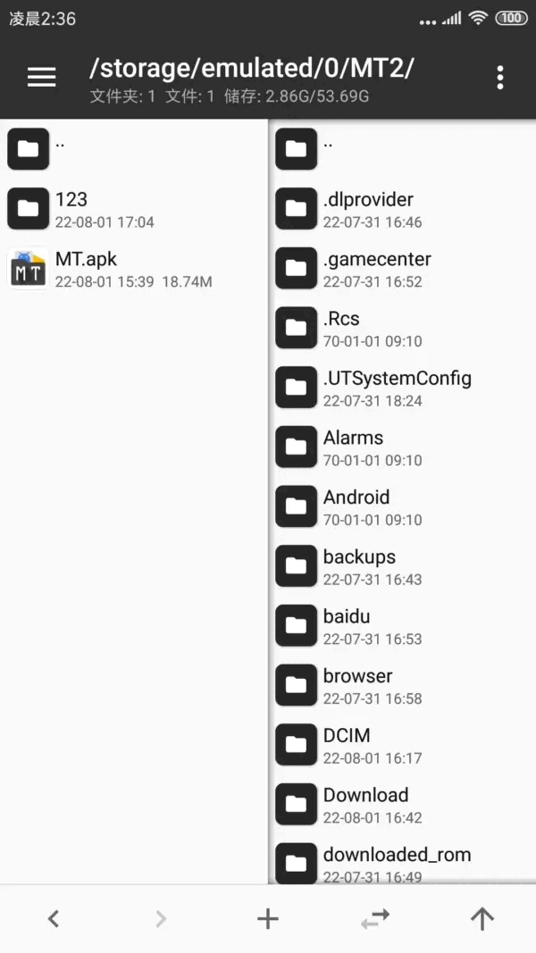 1、进入mt管理器,首先看到的是左右两个文件列表窗口。