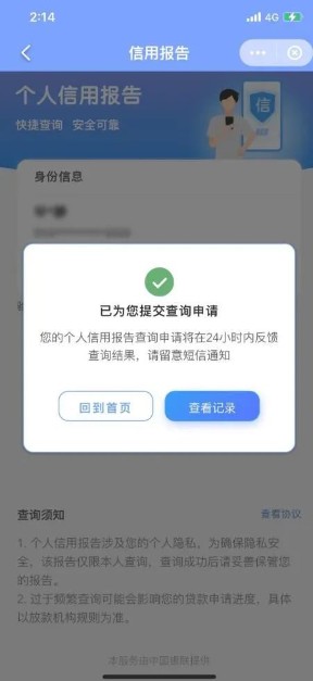 4、提交查询申请之后,我们就可以等待报告生成,当征信报告结果出来后,一般就会发送短信通知我们。