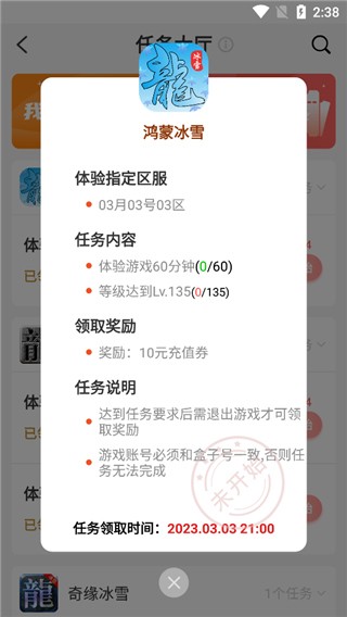 3、注意,每个任务都有特定的区服要求,达到任务要求后退出游戏领取奖励。确保游戏账号与盒子账号一致,以顺利完成任务。